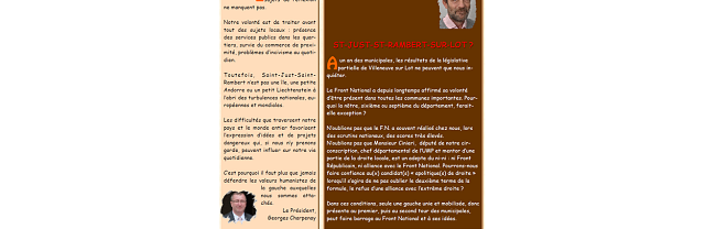 Toujours le souci de relier l’actualité locale, voire très locale avec les difficiles réalités du monde : défense des services publics, émergence d’idées et de projets dangereux pour la démocratie...